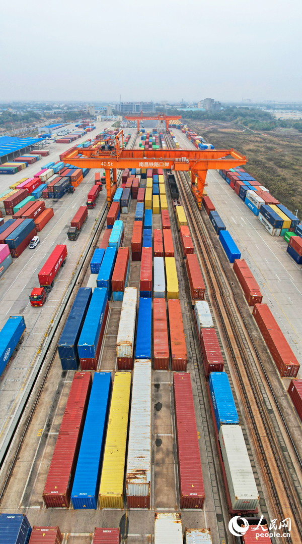南昌國際陸港貨場,龍門吊在裝運進出口貨物集裝箱。人民網記者 毛思遠攝