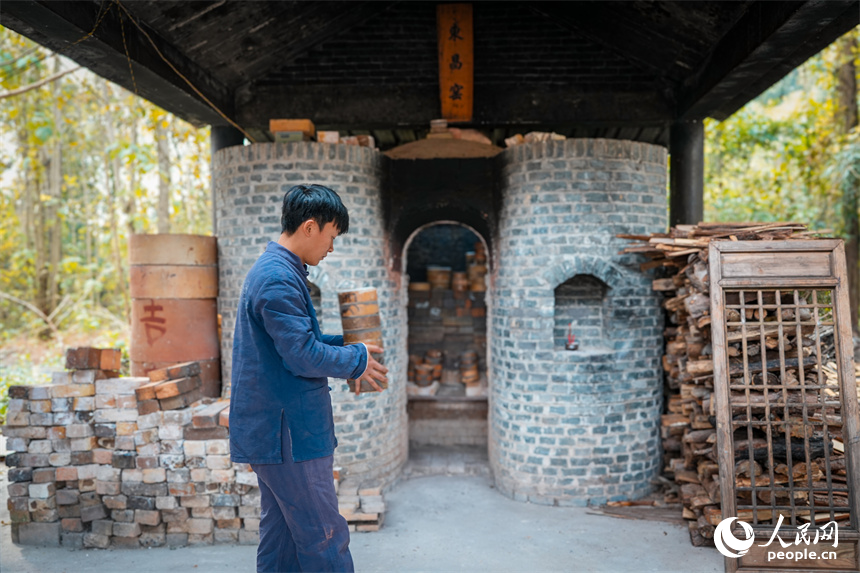 工匠將放好桑葉的瓷坯裝進匣缽,準備一起放入窯內燒制。