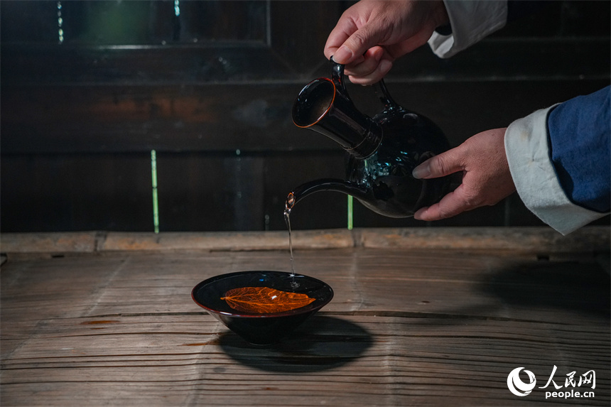 現場,羅軍平給記者進行了演示,只見他將茶水緩緩注入盞中,在水的折射下,一片樹葉漸漸從盞底“浮”上水面,葉片姿態舒展,脈絡清晰。