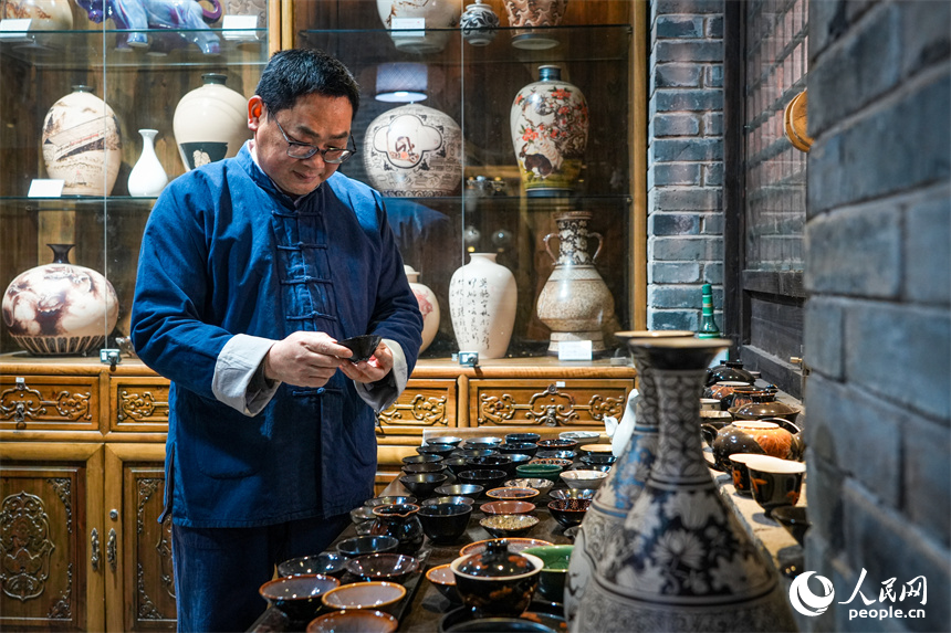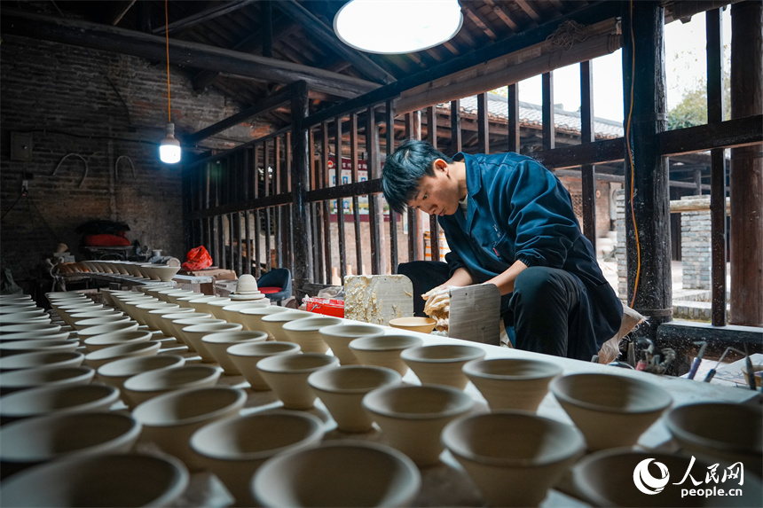 在吉州窯古陶瓷研究所作坊內,工匠正在給瓷坯上釉。
