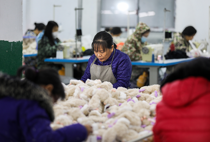 2025年1月7日,在江西省萍鄉市湘東區老關鎮一家玩具廠生產車間里,工人在布絨玩具生產線上趕制訂單。