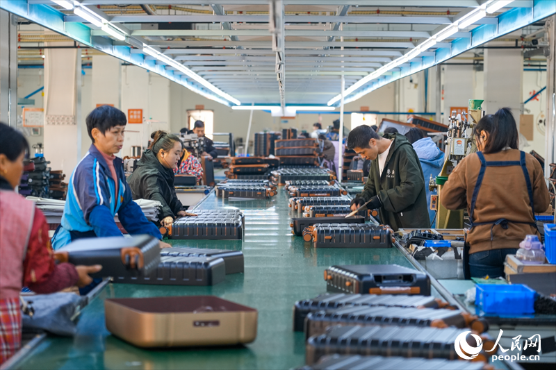 工人們正在生產線上組裝箱包。人民網 涂詩軒攝