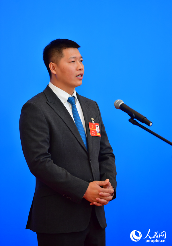 江西省人大代表、贛州南康區家具協會會長羅海龍在“代表通道”上接受采訪。人民網記者 時雨攝