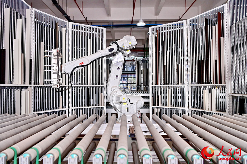 位于贛州市南康區的一家家具零部件共享智能工廠內,機械臂正在批量加工家具零部件。人民網 朱海鵬攝