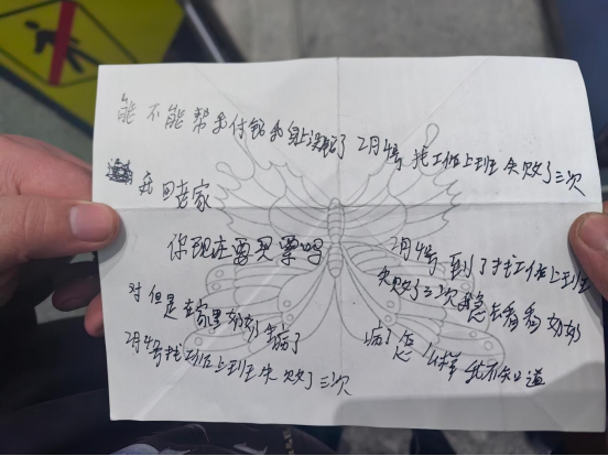 通過紙筆交流得知,該男子因祖母病重急需返回山東菏澤,但因經濟困難滯留車站。紙上歪斜的字跡寫著:“奶奶病重了”“我沒有錢”“我想回家”。