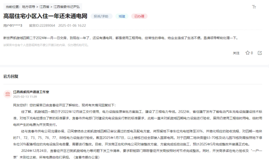 關于反映宜春市凱旋城(四期)沒有接入國家電網,居民仍在使用工程臨時用電的問題。經宜春市委核辦,凱旋城(四期)分兩個地塊開發,其中,一地塊通過電力驗收后,2025年1月已接入國家電網。二地塊電力擴容改造方案正在對接,預計2025年5月完成整改。