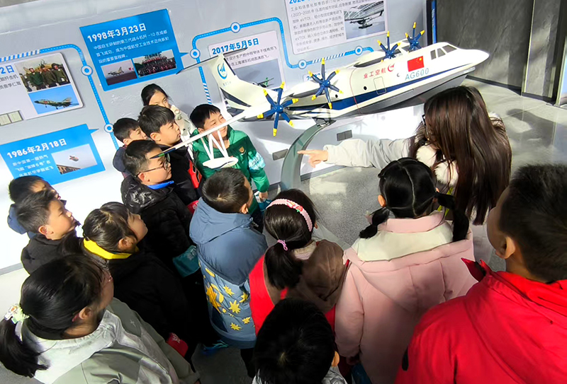 在空中未來航空研學基地,學生們圍在飛機模型旁認真聽講解。受訪者供圖