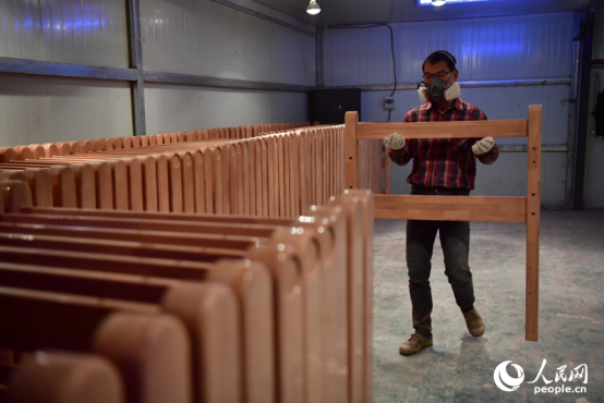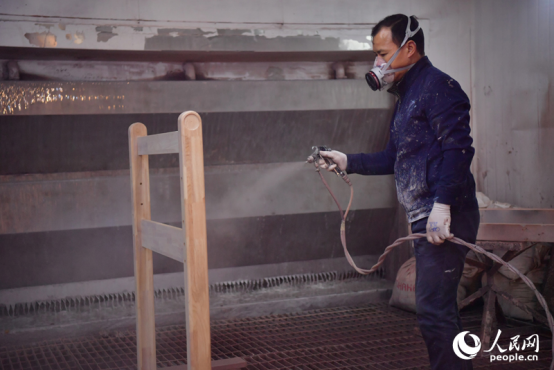 油漆工將噴涂好的木料堆放烘干。人民網記者 時雨攝