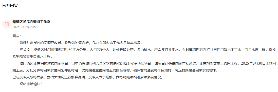 小小一滴水,關乎大民生。收到網友留言后,該區立即安排工作人員核實情況。經核實,九江市柴桑區城門街道面積約50平方公里,人口2萬余人,地處丘陵地帶,多山缺水,群眾多打井用水,有時籌資四五萬打井三四口都出不了水,而且水質一般,群眾希望能夠實施自來水工程。