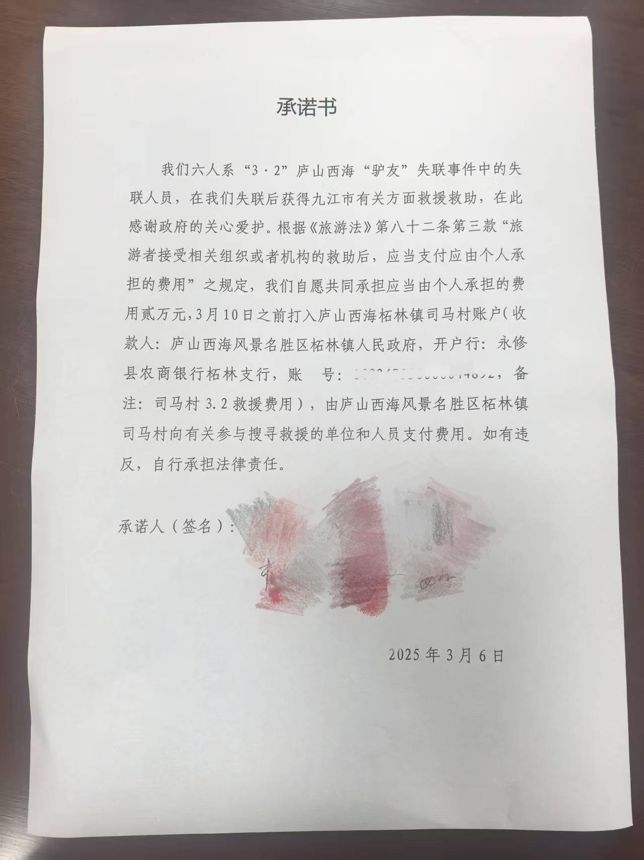 3月6日,江西省應急管理廳、九江市應急管理局、廬山西海產業發展局、廬山西海公安分局柘林派出所等部門相關代表對6名被困“驢友”進行警示教育約談,6名“驢友”簽署了悔過具結書、承諾書,共同承擔2萬元救援費用。廬山西海公安分局柘林派出所民警對該活動的組織者鄧某進行批評教育,責成其承擔4000元人民幣的救援費用。