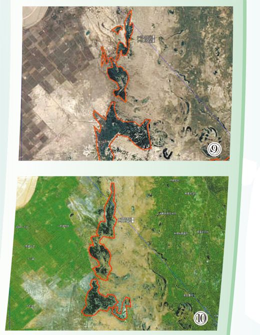 地表水被過量使用,生態用水被擠占,水域面積不斷縮小,周邊植被退化,加劇土地荒漠化。大量高礦化度的農業排水影響沿岸植被生長。農田防護林網不完善,已有林帶退化嚴重,周邊沙化加劇。(見圖⑨)
