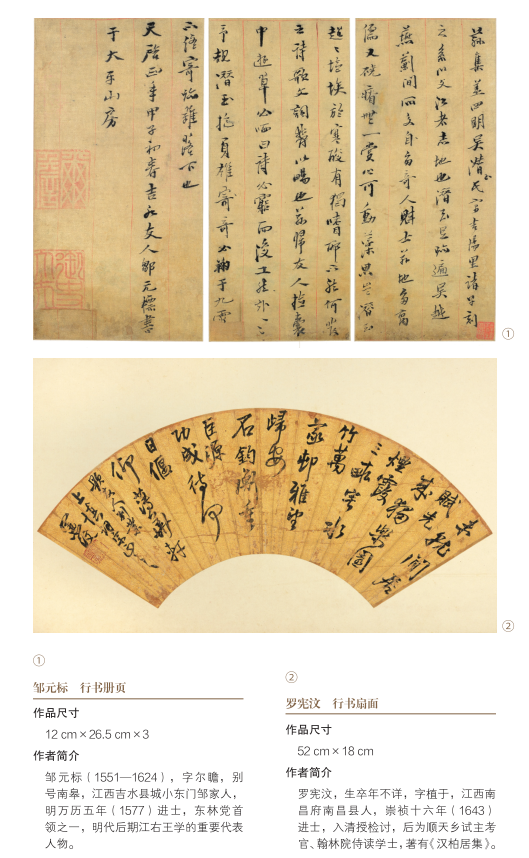 第三個學術特點是凸顯了江西私家收藏的藝術史視角。中國藝術史歷來便是在公私收藏兩條脈絡中并行?;始沂詹厝缣铺?、宋徽宗、清乾隆等以收藏量大、書畫家及藝術門類齊全為特點,而私家收藏如唐褚遂良、宋米芾、元趙孟頫、明項元汴、清王原祁等以市場流通、人情雅債而形成各自面貌?!都埳舷喾辍芬粫闶且越鞑丶沂詹氐淖髌窞榛A,著重江西鄉賢書畫,文化名流手札的研究。書后的《江右先賢》作品附錄,收入從明代鄒元標至現代彭醇士共45位書畫家作品。有些書畫家存世作品極少,甚至為孤品。這一附錄是江西鑒藏家視角下的江西文化藝術史,更是深入研究江西古代書畫史的寶貴圖像文獻資料。