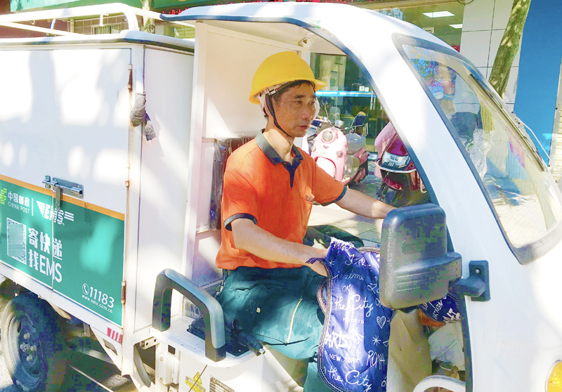投遞員在頂著烈日投遞報刊和包裹。高科峰攝