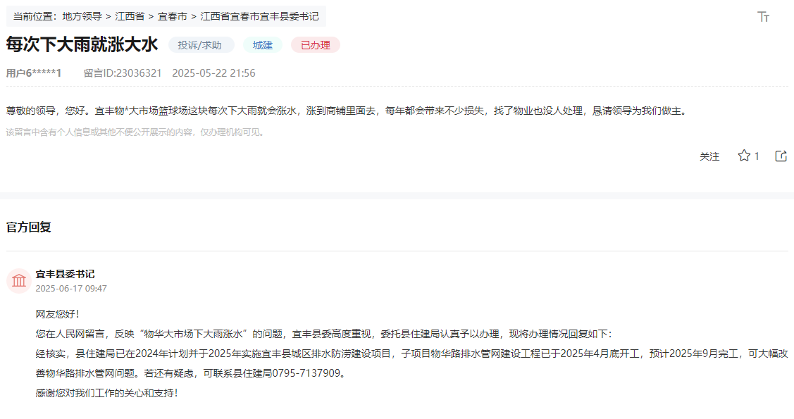 經核實,宜豐縣住建局已在2024年計劃并于2025年實施宜豐縣城區排水防澇建設項目,子項目物華路排水管網建設工程已于2025年4月底開工,預計2025年9月完工,可大幅改善物華路排水管網問題。