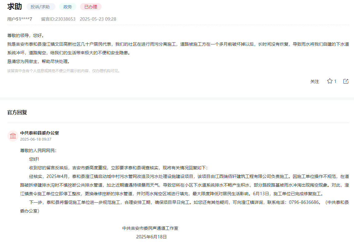 經核實,2025年4月,泰和縣澄江鎮啟動城中村污水管網改造及污水處理設施建設項目,該項目由江西瑞佰軒建筑工程有限公司負責施工。因施工單位操作不規范,在道路破拆修建排水溝時不慎挖斷公共排水管道,加之近期遭遇持續暴雨天氣,導致留言群眾所在小區下水道系統排水不暢產生積水,部分路段路基被雨水沖淘出現掏空現象。
