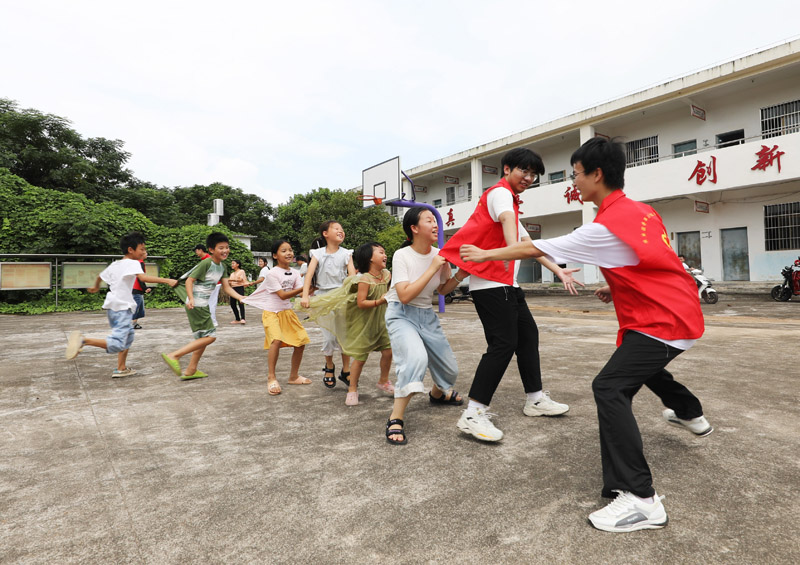 近日,在江西省撫州市東鄉區珀玕鄉大部村,返鄉大學生志愿者正與孩子們一起玩游戲。暑假期間,共青團江西省撫州市東鄉區委組織大學生志愿者走進社區鄉村開設暑托班,精心設計閱讀、繪畫、音樂等多元化課程,組織多彩的文體游戲活動,陪伴兒童健康快樂成長,豐富孩子們的暑期生活。(饒方其)