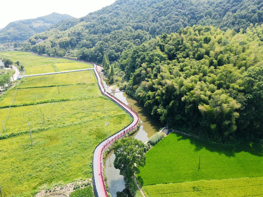 連片的稻田邊,只見一條彩色的休閑步道穿行其間,格外亮眼。