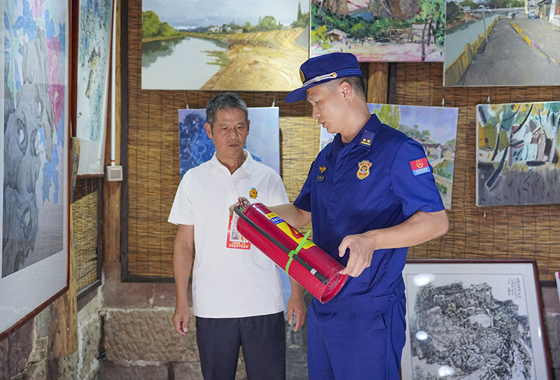 2025年9月17日,江西省撫州市南豐縣洽灣船型古鎮,消防監督員在檢查消防設施。