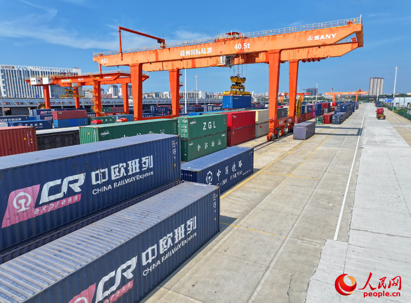 “剛建港時,進口業務占90%,如今進出口比例已基本平衡?!毙s輝表示,贛州國際陸港班列運輸的商品日益豐富,線路輻射的范圍不斷延展,贛南臍橙、玻璃纖維布、頭盔、洗護用品等贛南“特產”不斷從這里走出國門,奔向世界。