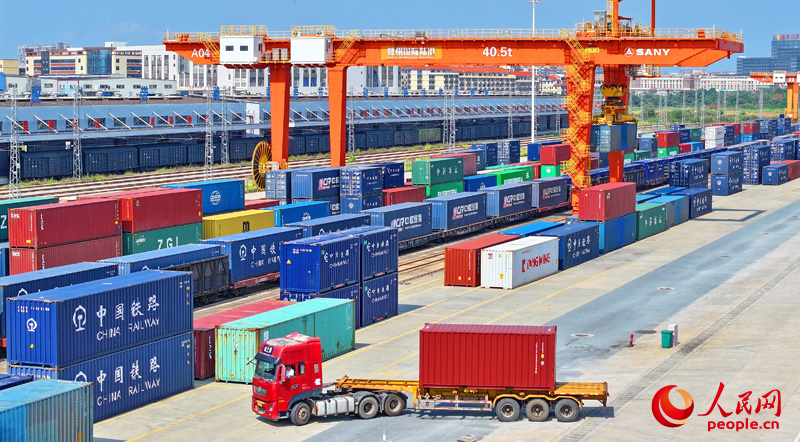 9月16日,位于江西省贛州市南康區的贛州國際陸港貨場,進口木材和出口家具貨物集裝箱吊裝作業快速有序進行。人民網 朱海鵬攝