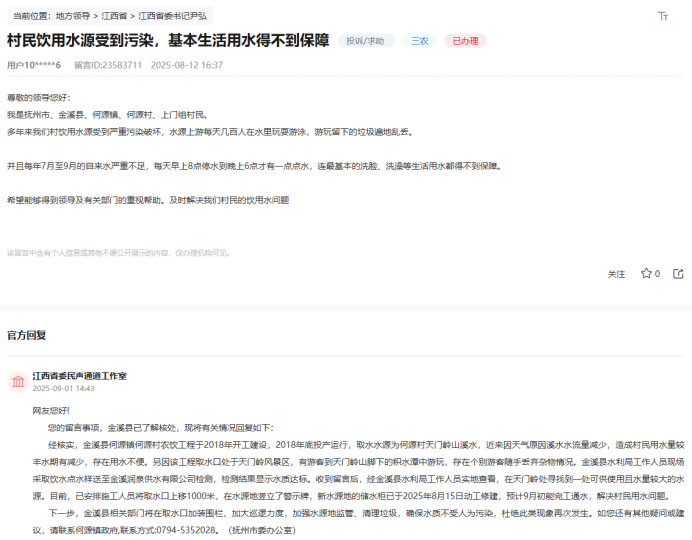 關于反映金溪縣何源鎮何源村自來水水源受到污染的問題。經金溪縣委核辦,當地組織人員實地勘查后將取水口上移了1000米,并在水源地豎立警示牌,安裝護欄、加強巡邏。目前,改造工程已完工并通水。