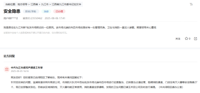 關于反映九江市潯陽區某布匹市場存在消防隱患的問題。經潯陽區委核辦,湓浦街道會同相關部門對該市場開展巡查整治,排查出阻礙消防通道、門店未配備滅火器等安全隱患27個,目前已全部整改到位。