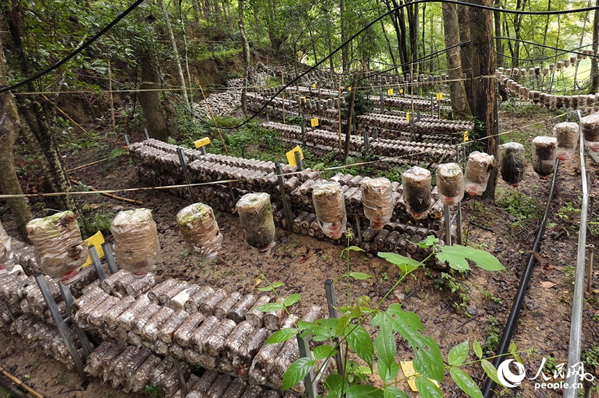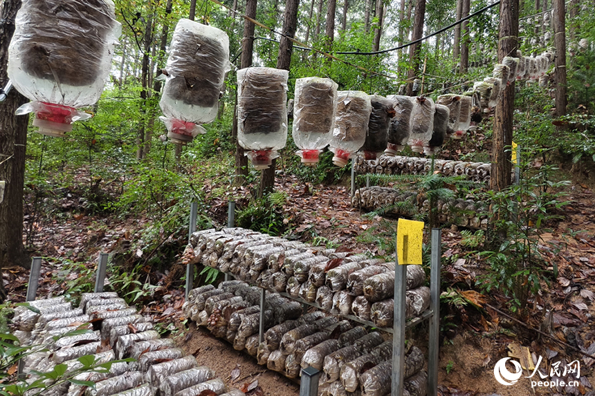 旴江林場林下經濟示范點內擺放整齊的菌包。人民網記者 時雨攝