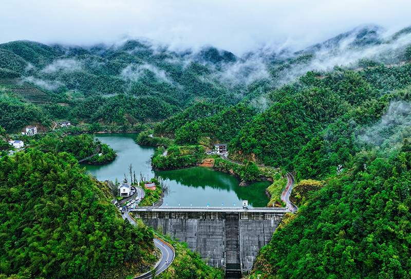 在江西省萍鄉市湘東區廣寒寨鄉,大沙江水庫碧波蕩漾,連片竹海在風中搖曳生姿。