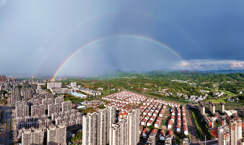 10月14日,一場大雨后,江西贛州會昌縣城上空出現一道絢麗雙彩虹,與遠山、田園、樓宇、道路交相輝映,構成一幅美麗的秋日生態畫卷。(呂春華)