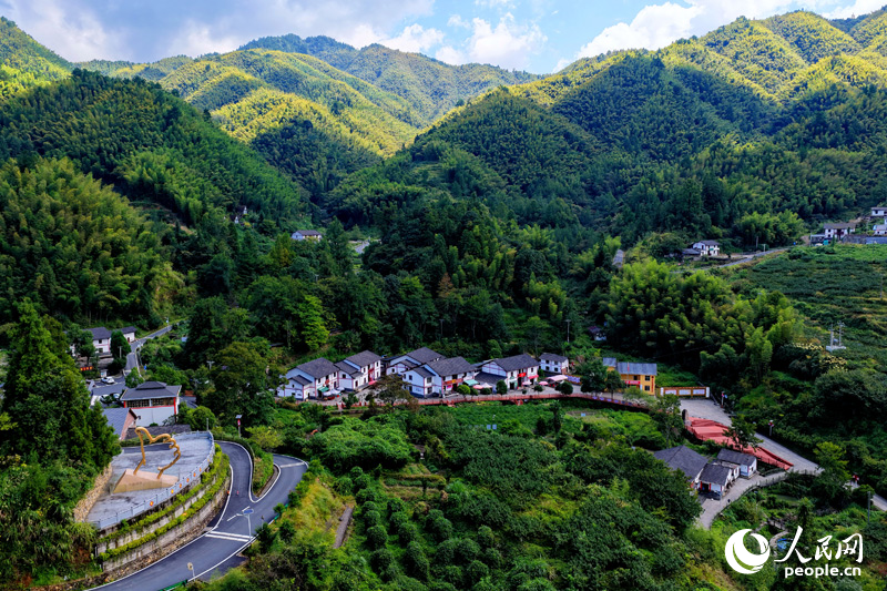 航拍江西省井岡山市茅坪鎮神山村,藍天白云、綠樹翠竹、公路農房相互掩映。人民網 朱海鵬攝