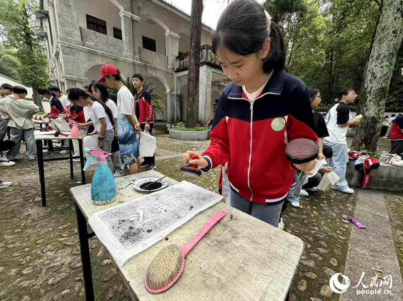來白鹿洞書院研學的學生們正在體驗拓印。人民網記者 羅娜攝